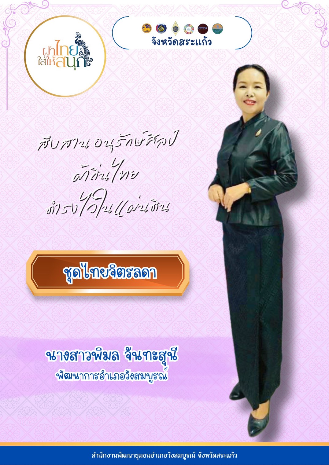 นางสาวพิมล จันทะสุนี พัฒนาการอำเภอวังสมบูรณ์ ขอเชิญชวนร่วมสวมใส่ผ้าไทย ชุดพระราชนิยม มรดกแห่งสมเด็จพระนางเจ้าสิริกิติ์ พระบรมราชินีนาถ พระบรมราชชนนีพันปีหลวง มรดกแห่งความภาคภูมิใจ และอัตลักษณ์ความเป็นไทย
