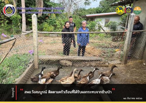 นางสาวพิมล จันทะสุนี พัฒนาการอำเภอวังสมบูรณ์ พร้อมด้วยเจ้าหน้าที่พัฒนาชุมชนอำเภอวังสมบูรณ์ ลงพื้นที่ติดตามครัวเรือนที่ได้รับผลกระทบจากช้างป่า ที่เข้าร่วมโครงการพัฒนาอาชีพหมู่บ้านคนรักษ์ช้าง ตามหลักปรัชญาของเศรษฐกิจพอเพียง จังหวัดสระแก้ว ปีงบประมาณ ๒๕๖๗ (งบพัฒนาจังหวัด) บ้านคลองอุดม หมู่ที่ ๖ ตำบลวังทอง โดยได้รับการสนับสนุนอาชีพการเลี้ยงเป็ดพันธุ์ไข่ ปัจจุบันยังมีการดำเนินการอยู่ เป็ดออกไข่ตามปกติ ผลผลิตที่ได้สามารถจำหน่าย และทำอาหารทานในครัวเรือน รวมถึงการแบ่งปันให้กับเพื่อบ้านข้างเคียงได้ สร้างรายได้เพิ่มให้กับครัวเรือน และสร้างความสัมพันธ์ที่ดีของคนในชุมชนอีกด้วย