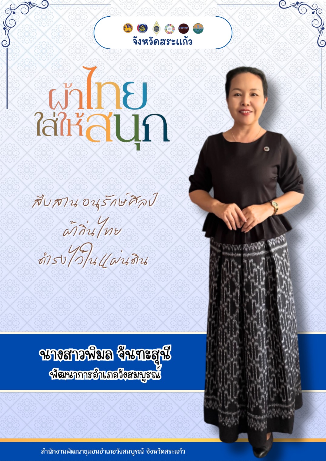 นางสาวพิมล จันทะสุนี พัฒนาการอำเภอวังสมบูรณ์ ขอเชิญชวนร่วมสวมใส่ผ้าไทยชุดสุภาพ หรือผ้าไทยชุดพระราชนิยม มรดกแห่งสมเด็จพระนางเจ้าสิริกิติ์ พระบรมราชินีนาถ พระบรมราชชนนีพันปีหลวง มรดกแห่งความภาคภูมิใจ และอัตลักษณ์ความเป็นไทย